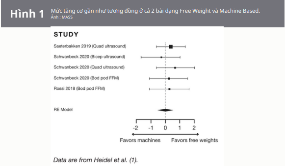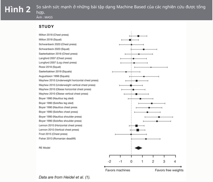 - Chúng ta sẽ có được câu trả lời thông qua một bài phân tích tổng hợp (Meta-Analysis) được thực hiện bởi “Heidel và đồng nghiệp” (1), để giúp so sánh sự khác biệt giữa các bài tập Free Weight và Machine-Based trong việc tăng cơ (Hypertrophy) và tăng Sức mạnh (Strength và Power).