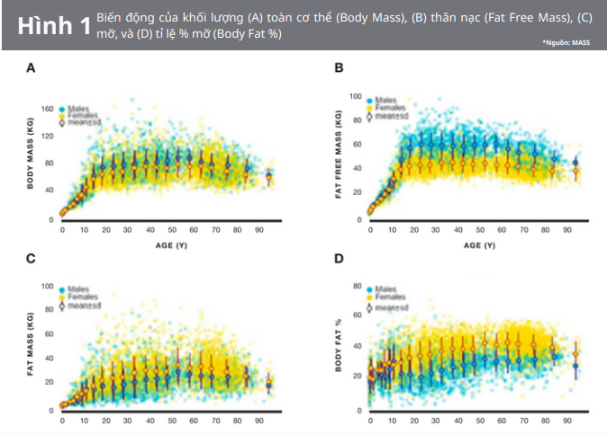 - Xu hướng biến động về cân nặng cơ thể (body mass – BM), lượng thân nạc (FFM), lượng mỡ (fat mass – FM) và tỉ lệ mỡ trên cơ thể (body fat percentage – %BF): của nam giới và nữ giới giống nhau xuyên suốt vòng đời. Giá trị thực tế ở các thông số có sự chênh lệch vì nam giới thường có nhiều FFM và BM hơn (nặng hơn và lắm cơ hơn), còn nữ giới có FM và %BF cao hơn (nhiều mỡ hơn) (Hình 1);