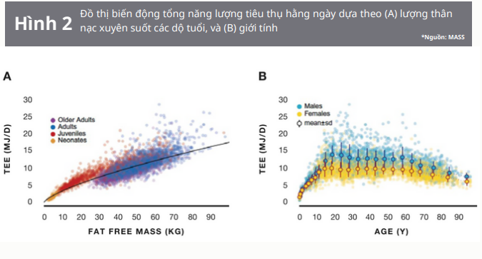 - Một điều dễ thấy ở trong Hình 2A là sự khác biệt về TDEE của hai cá nhân với cùng FFM. Tuy nhiên, khác biệt giữa hai cá nhân không thể hiện xu hướng trung bình. Bên cạnh những cá thể tạo nên xu thế, sẽ có những cá thể đặc biệt nằm ngoài xu hướng chính. Những cá thể đặc biệt này sẽ luôn cần coaching (dẫn dắt bởi huấn luyện viên) do những tài liệu hiện có sẽ khuyên họ ăn không đúng theo nhu cầu thực tế.