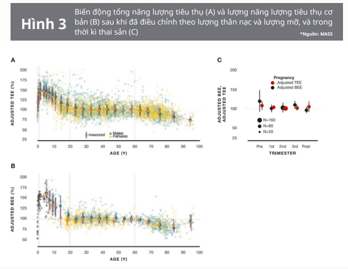 - Khi xét theo FFM và FM, biến động TDEE và chỉ số trao đổi chất cơ bản (basal energy expenditure – BEE, hay còn gọi là BMR) ở nam giới tương đương với nữ giới. Bên cạnh đó, TDEE và BMR của nữ giới dù ở mức không đổi trong và sau giai đoạn mang thai; (Hình 3)