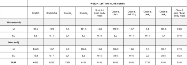 Khi khớp theo LBM, nữ giới có thể đạt được lần lượt 91% và 93% thành tích của nam giới ở hai chuyển động Snatch (Cử Giật) và Clean & Jerk (Cử Đẩy). Khác biệt này còn có thể rút ngắn hơn nữa khi chúng ta tính đến khối lượng cơ xương (skeletal muscle mass), vì nữ giới có ít cơ xương trong LBM hơn nam giới (3).